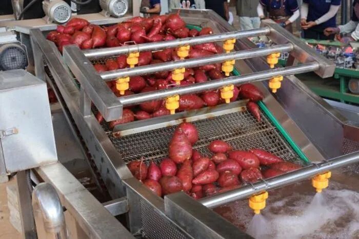 新鲜蜜薯运抵加工车间后,即刻开启“品质升级”之旅。经过机器清洗、风干、分拣、定级,便进入高温愈合环节。60℃恒温愈合工艺结合智能温湿度控制系统,将蜜薯保鲜期从15天延长至90天,彻底破解“丰收即滞销”难题。