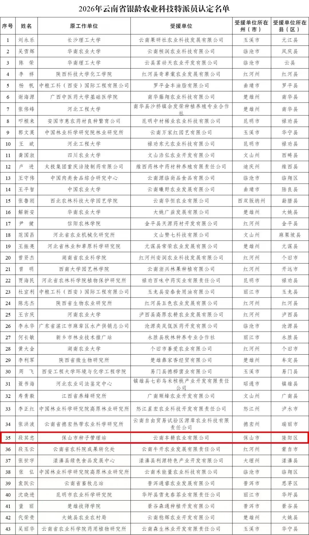 根据《云南省新时代“银龄人才万人计划”实施方案》(云厅字〔2024〕43号)、《云南省科技计划项目管理办法》(云科规〔2022〕5号)、《云南省科技特派员管理办法》(云科规〔2023〕8号)等规定,省科技厅认定云南果研社农业科技发展有限公司李永乐等43名同志为2026年云南省银龄农业科技特派员。现将有关事项通知如下: