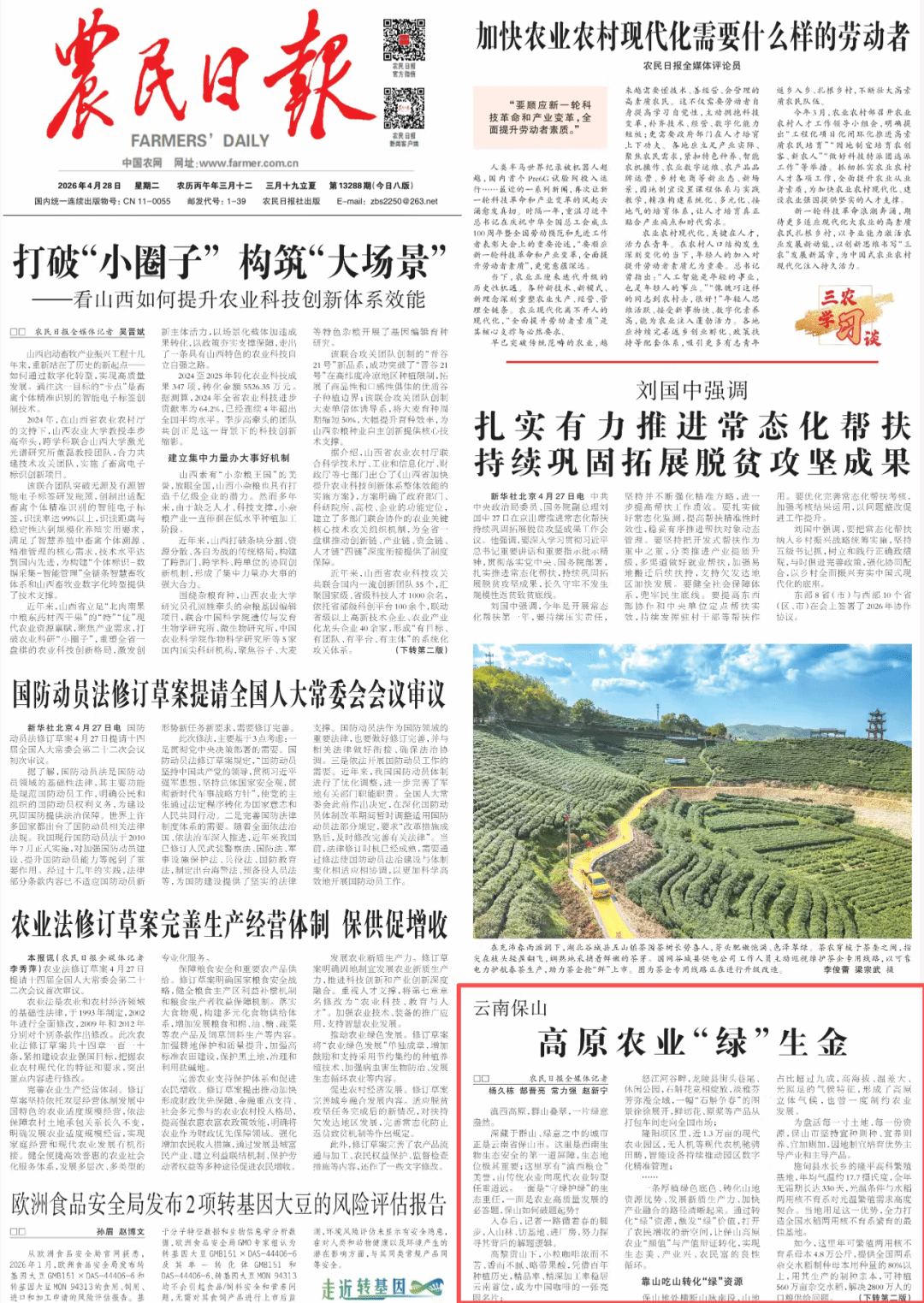 今日农民日报头版宣传保山农业,报道我市通过转化“绿”资源,激发“绿”价值,打开了农民增收的新空间,让保山高原农业“颜值”与产值辩证转化,实现生态美、产业兴、农民富的良性循环。