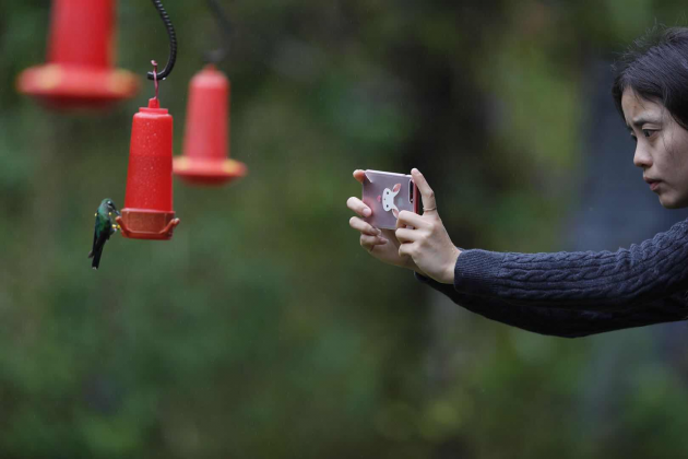 在哥斯达黎加,市民通过喂鸟器喂食糖水招引蜂鸟进行拍摄观赏。供图/李思琪
