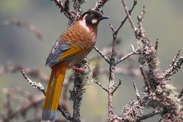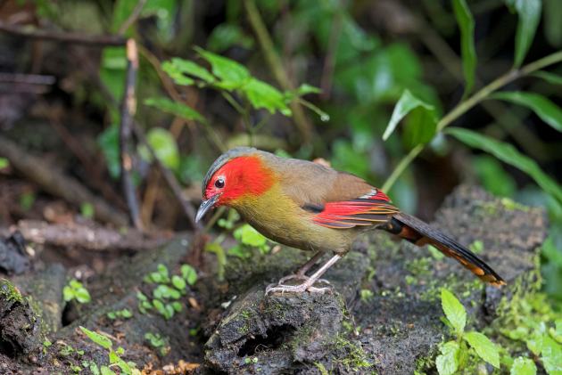 赤尾噪鹛在高黎贡山中山地带分布,也是百花岭鸟塘特色鸟种。图为摄影师在纯野外拍摄的赤尾噪鹛。摄影/李利伟