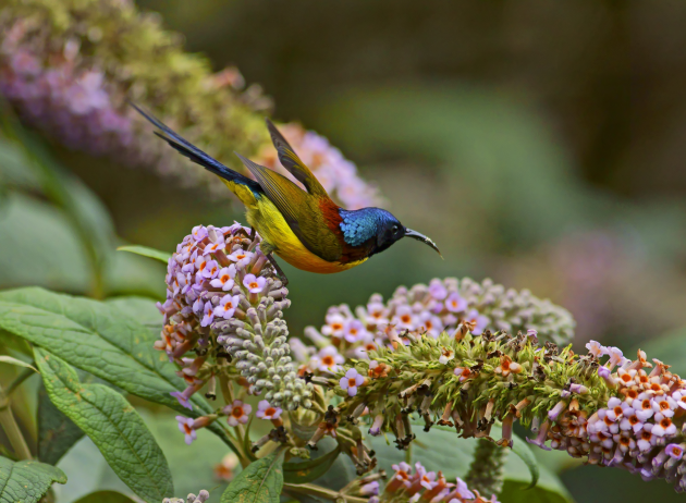 太阳鸟身体娇小,羽色艳丽,让人看到就心生喜感。图为摄影师在百花岭拍摄的绿喉太阳鸟。 摄影/鲁韬