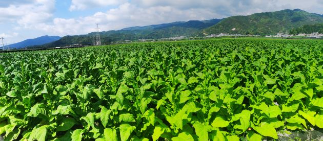 阳春三月,播种希望。烟农细细将田里的土翻一遍,捡去土里的石头、树根等杂物,再将土一垄一垄理成墒,在理好的烟墒上挖出坑来,引来渠水滋润,最后浇上肥料水。阳光加热了满田的水,发酵了泥土里的生命,就变成了一畦畦的温床,最后将烟苗移栽到这些“温床”里,盖上薄膜,就完成了烟苗的移栽。孟夏之际,烟农细心呵护,每天穿梭于新绿的烟田里给烟苗除草、浇水、施肥、打药等等。烟苗在二十四节气昼夜不息的运转中一寸一寸地成长着。盛夏之时,大自然的一双巧手用时光的线条将它们纺织成了绿毯,覆盖着辽远圹埌的田野,这大片大片的绿,承载着农民们丰收的希望。