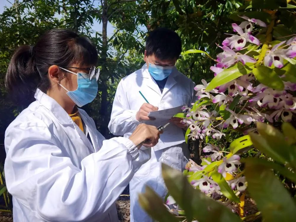 来自云南农业大学的在读研究生正在龙陵县石斛种质资源中心观察石斛花开。