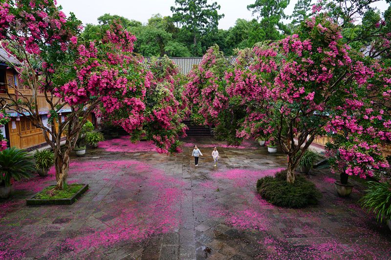 当古建筑木质的素朴,叠檐飞拱的雄壮,雕梁镂窗的精美,金彩粉饰的典雅,与映阶窥窗、飞霞流丹的紫薇花相衬相映,一幅诗意的画卷便徐徐展开了。碧瓦飞甍间,雕梁画栋下,紫薇花团团簇拥,串串坠玉,姹紫嫣红,云蒸霞蔚。