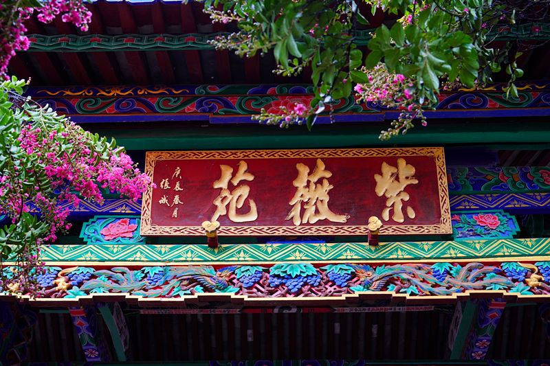 腾冲一中紫薇苑里古建彩绘与紫薇花映衬之美