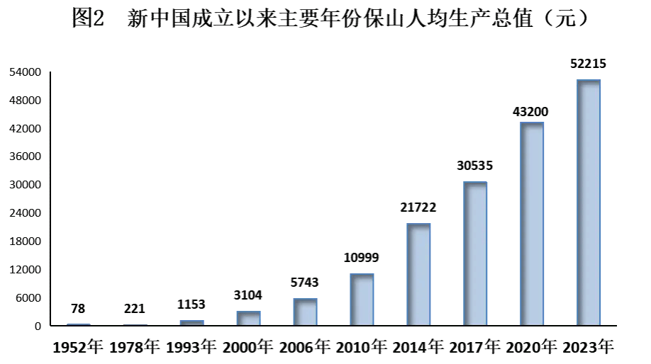 经济总量连上新台阶。经过75年的艰苦奋斗,保山市2023年生产总值达到1254.2亿元,是1952年0.85亿元的1476倍;人均生产总值达到52215元,是1952年的669倍。改革开放以来,保山市经济步入发展黄金时期,于2004年突破100亿达104.16亿元,2014年突破500亿元达540.24亿元,2020年突破1000亿达1052.58亿元。经济发展增速超过10%以上的年份达到22年,生产总值年均增长9%,人均生产总值年均增长8.3%,经济总量稳居全省第9位。