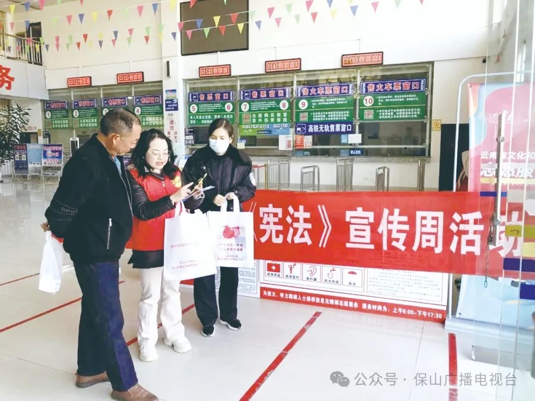 普法志愿者在隆阳区汽车南站开展宪法宣传。