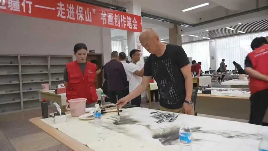 开幕式后,书画创作笔会在保山市图书馆举行。近30位来自全国各地的书画家围绕“边疆风情”“民族团结”等主题即兴创作,现场气氛热烈,墨香萦绕,充分展现了艺术家们深厚的艺术造诣与浓郁的文化情怀。活动结束后,笔会创作的作品将全部捐赠给保山市收藏。