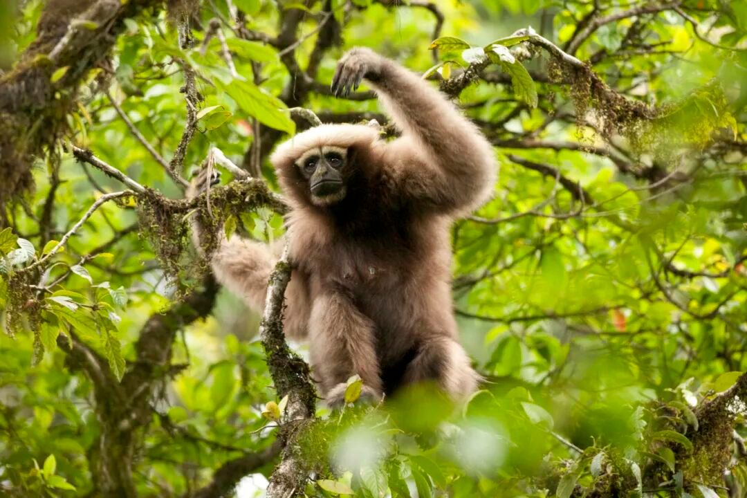 从2005年首次清晰记录后开展全面科考,到如今将14个家庭群和5只独猿全部纳入监测,高黎贡白眉长臂猿的保护措施不断细化升级。高黎贡山国家级自然保护区保山管护局局长于仕海介绍,目前已形成“地、林、空”立体监测模式:地上,组建专门监测队伍,每月固定时间用专业设备跟踪监测长臂猿生活习惯;林间,借助红外相机、声音记录仪等设备记录长臂猿鸣叫及“吃住行”影像;空中,在不影响长臂猿生活的前提下,用无人机监控评估其栖息地环境。
