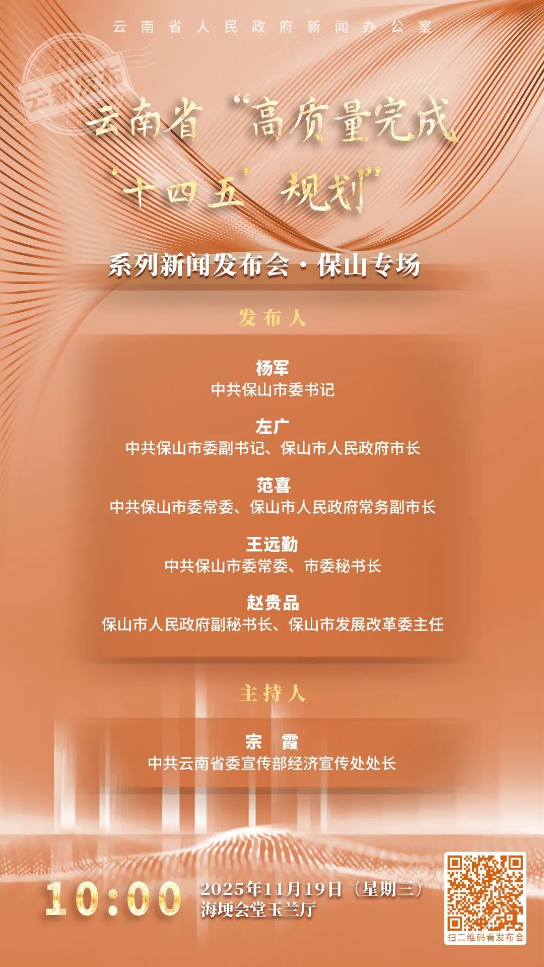 11月19日上午,云南省人民政府新闻办公室在云南海埂会堂举行云南省“高质量完成‘十四五’规划”系列新闻发布会·保山专场,介绍有关工作情况并回答记者提问。