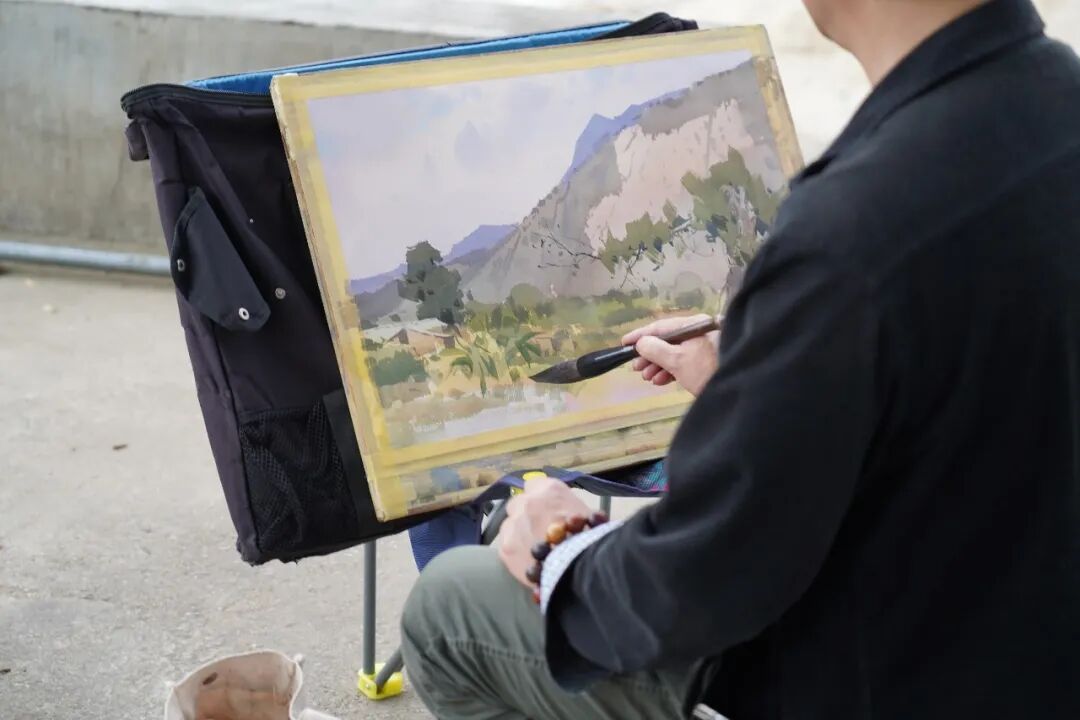 贵州省水彩·粉画艺委会副主任吴昌文分享了自己的创作思路:“高黎贡山脚下的山谷气势磅礴,我以山体为主景,搭配近景树木、田坝与土地,用画笔呈现这份视觉之美。”中国美术家协会会员刘兴和则以布莱恩咖啡馆为创作主体,他表示,新寨村的咖啡馆极具特色,自己尤为喜爱铁皮卡咖啡,每次到访都会购买。