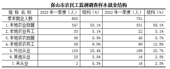 近年来,保山市认真贯彻落实党中央、国务院和省委、省政府决策部署,始终把保障农民工就业作为重要民生工作来抓。根据国家统计局保山调查队对230户农民工监测调查样本显示:2023年一季度保山农民工就业总体稳定。