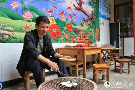 正在烘烤大米粑粑的李发顺 刘怡 摄