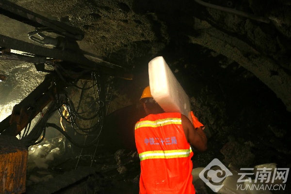 受恶劣地质和地形影响,隧道施工只能采取从进、出口两端独头掘进,巷道式的通风作业模式,使得独头掘进距离超过6公里,空气循环难度大,洞内含氧量不足6.1%,湿度接近100%,隧道最前端的掌子面环境温度常年保持在42摄氏度以上,高温高湿缺氧的环境时刻考验着建设者的意志和体能。施工人员每隔2个小时就得换班,不然体力很难支撑。为改善施工环境,云桂铁路公司组织中铁二十三局等参建单位优化施工方案,改善通风条件,配置吸氧器材,每天运送20多吨冰块进洞给工人降温。