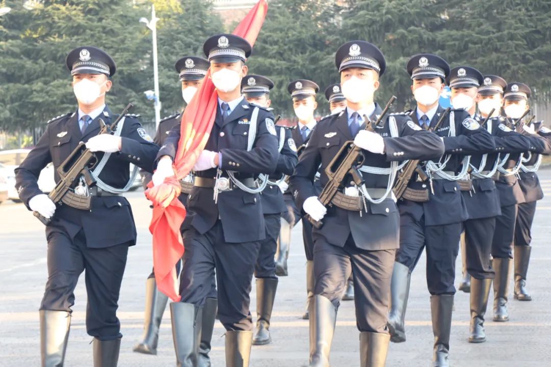 上午9时,在雄壮的国歌声中,鲜艳的五星红旗迎着朝阳冉冉升起,身穿警礼服、警容严整的民警们向国旗敬礼并高唱国歌,表达对党、对祖国、对人民、对公安事业的无限忠诚和热爱。随后,伴随着《中国人民警察警歌》激扬的旋律,中国人民警察警旗也冉冉升起,全体民警面向警旗庄严宣誓,一句句誓言铿锵有力,一声声承诺掷地有声,表达了民警们坚定的从警信念。