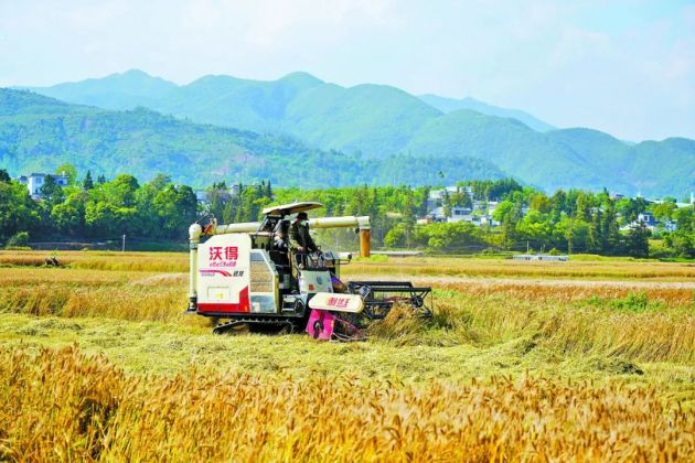 保山市昌宁县田园镇上达丙村民小组村民陈永葵家的麦田里,收割机来回穿梭收割大麦。