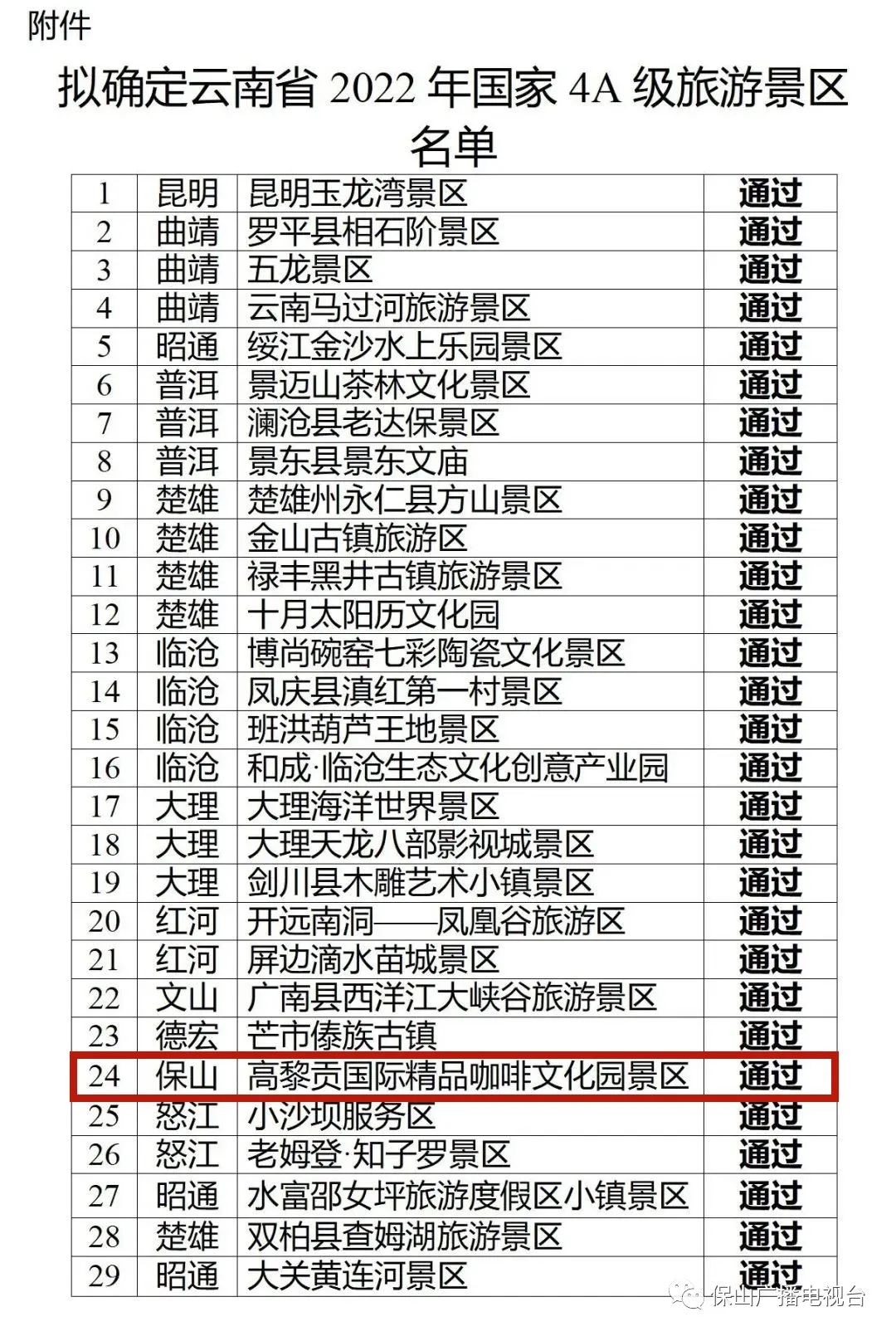 根据《旅游景区质量等级的划分与评定》(GB/T 17775-2003)国家标准和《旅游景区质量等级管理办法》要求,经各州(市)文化和旅游局初评、推荐,省文化和旅游厅按程序认真组织开展了2022年国家4A级旅游景区评定工作,昆明玉龙湾景区等29家景区达到国家4A级旅游景区的标准,拟确定为云南省2022年国家4A级旅游景区。