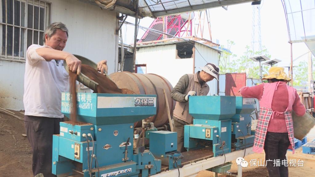 在隆阳区农盛农机服务专业合作社里,一台流水线育秧播种机正在平稳运行,工人们忙着递送秧盘、将基质土和稻种加入到播种机里,一系列流程井然有序,很快一个个成品秧盘就制作了出来。
