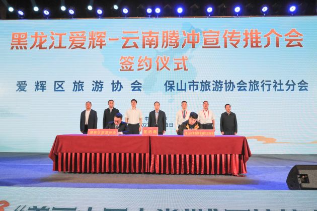 推介会上,爱辉区旅游协会与保山市旅游协会旅行社分会、中国瑷珲国际汽车营地与腾冲高黎贡山茶博园、黑河农品多农业科技有限公司与云南腾药制药股份有限公司就合作项目进行了现场签约。