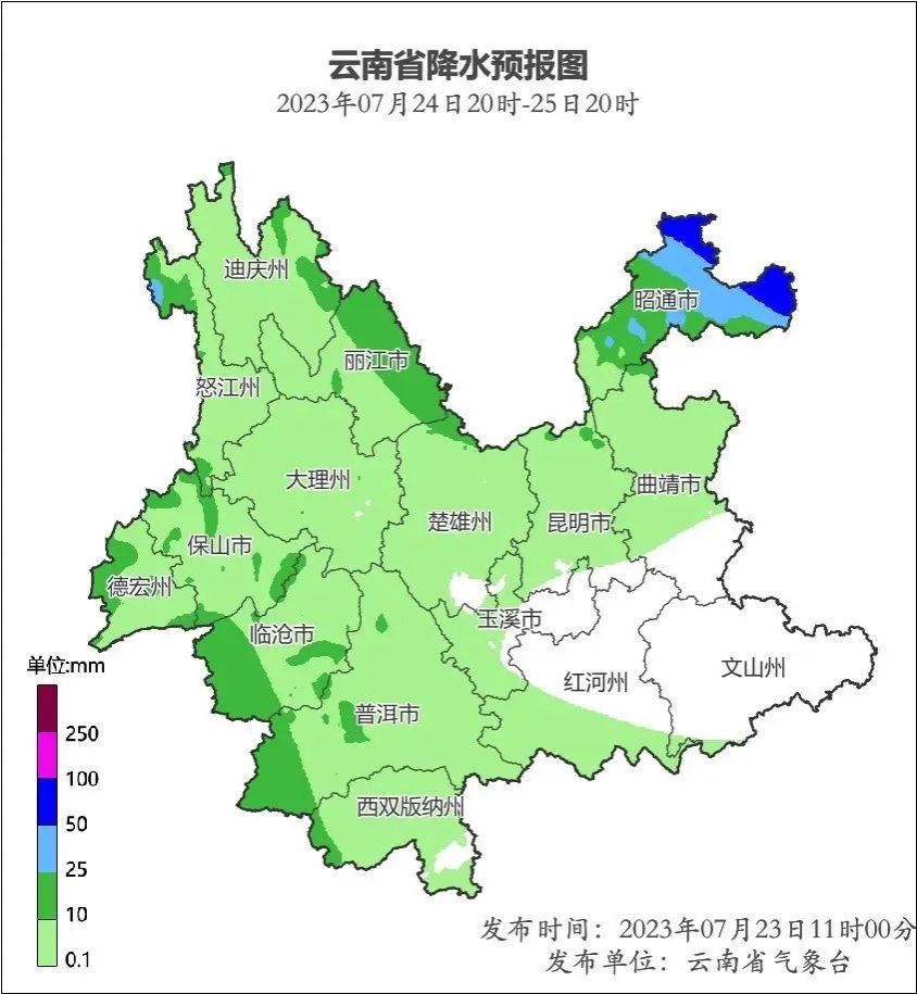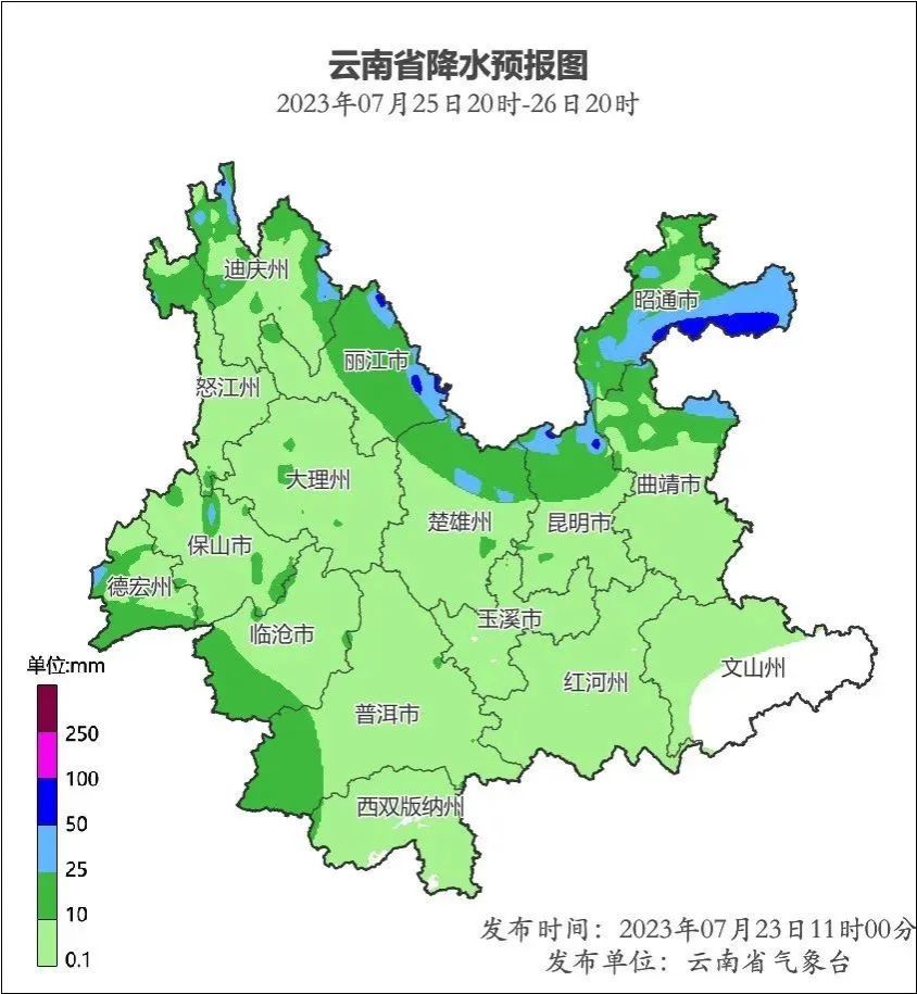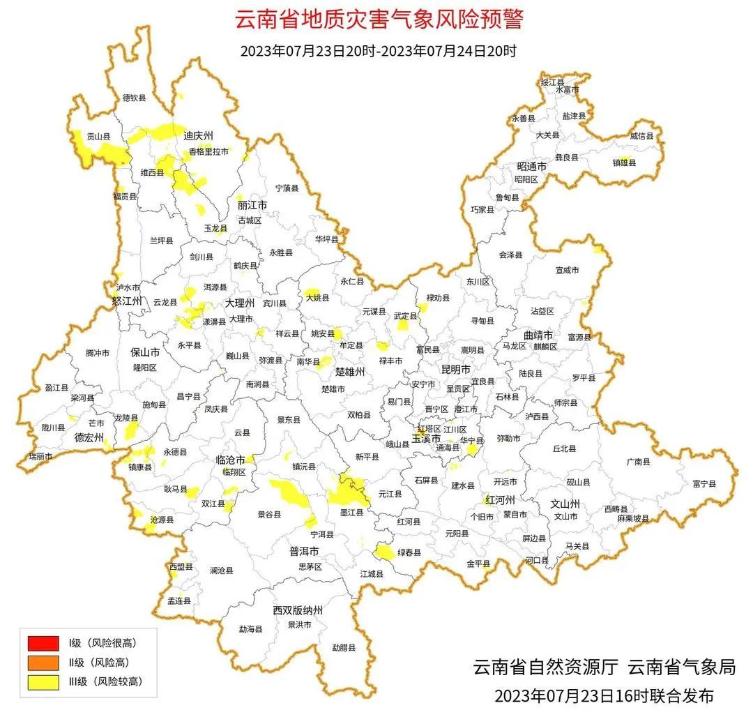 预计,2023年07月23日20:00~07月24日20:00,玉溪市红塔区,怒江州贡山县发生滑坡泥石流的风险高;昆明市西北部,昭通市东北部,曲靖市东北部、东部,楚雄州北部、西部,迪庆州中部至西部,怒江州北部、南部,丽江市中部至西部,大理州西部、中部,保山市南部,德宏州东部,临沧市东部、西部至南部,普洱市中部至北部、西南部,红河州西南部发生滑坡泥石流的风险较高。