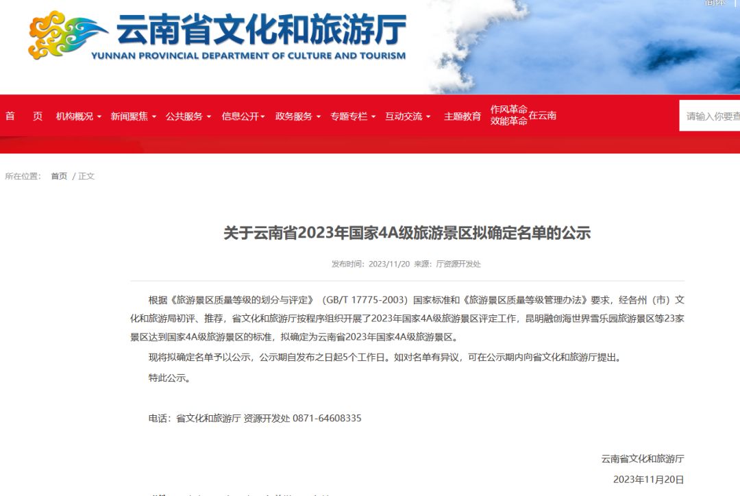 关于云南省2023年国家4A级旅游景区拟确定名单的公示