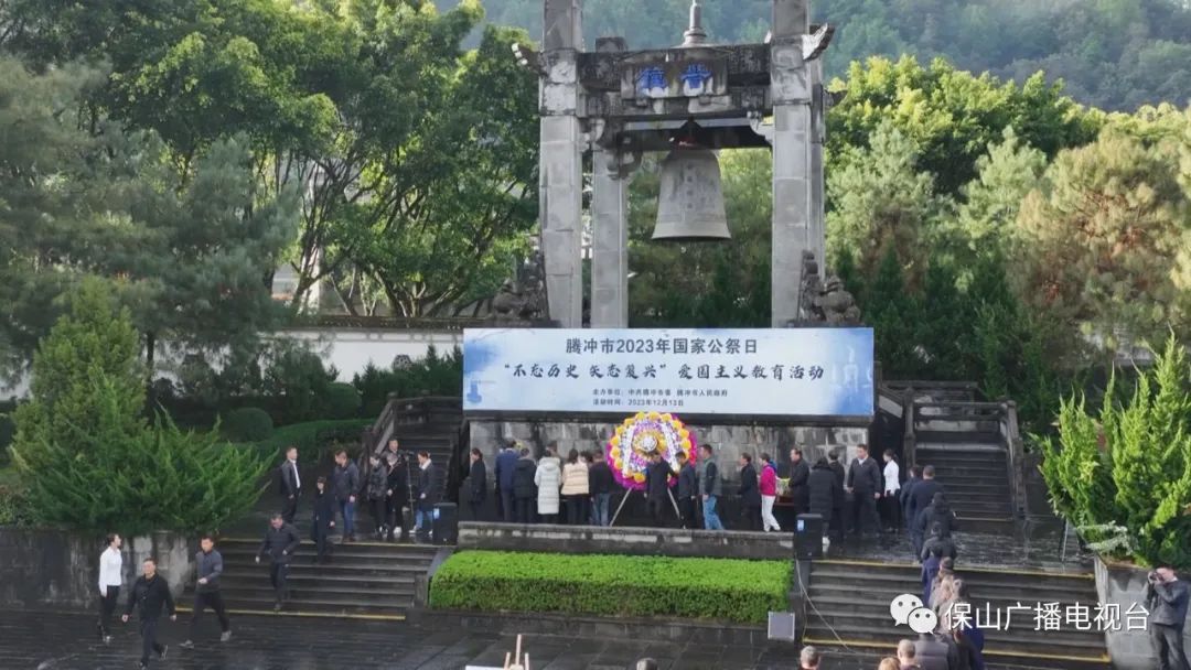 上午9时,在腾冲市滇西抗战纪念馆警钟广场,腾冲市2023年国家公祭日爱国主义教育活动正式开始。在场全体人员向阵亡将士及死难同胞默哀,并敬献花圈,集体朗诵了《南京大屠杀死难者国家公祭鼎铭文》。滇西应用技术大学腾冲珠宝学院大学生志愿者、滇西抗战纪念馆讲解员为在场的全体人员分享了诗朗诵《跨越百年的承诺》《山河之祭》以此缅怀先烈,寄托哀思。