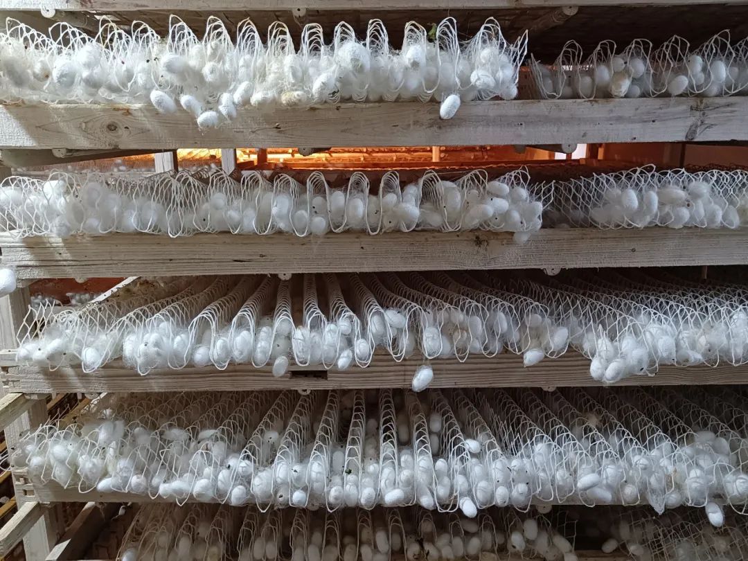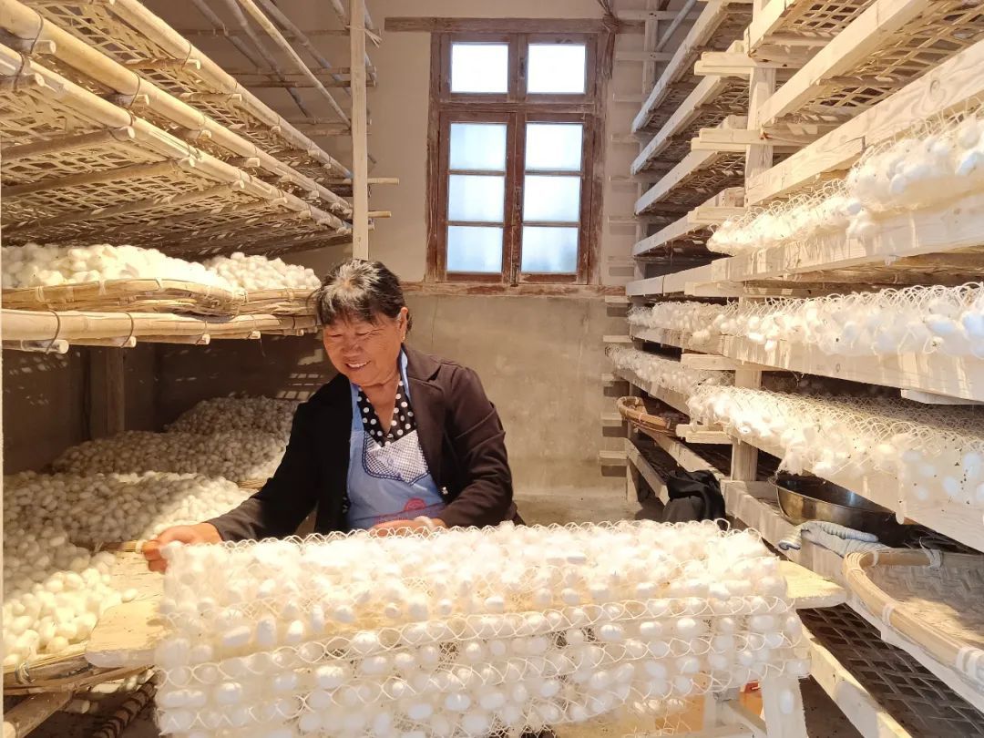 如今的永福村,田间是望不到边的“绿浪”,蚕房是堆成山的 “白雪”,这片土地上的人们,正用最朴素的劳作,让“春采桑、夏养蚕” 的传统,结出实实在在的致富果。“光卖蚕茧赚的是辛苦钱,把蚕丝做成被子,价钱能翻几番” 这是永福村第一批“吃螃蟹”的村民们,在江浙考察后带回的“新想法”。几年前,5位村民自发组队南下取经,白天在丝绸厂跟着师傅学煮茧、缫丝、拉丝,晚上在宿舍里记笔记、画流程,3个月的“学徒期”结束时,每人带回3本写满了的笔记本。学成归来后,他们带头办起了村里第一批蚕丝加工厂。“老字号” 蚕丝被厂坚守“一茧一丝不掺假”的传统工艺,从周边村寨收茧加工,年产820床蚕丝被,5万多斤蚕茧在这里变成柔软的被褥,通过县城实体店走进千家万户.“永福丝绸”则玩起了新花样,年轻的负责人带着员工拍短视频、开直播,把蚕丝被的制作过程搬上屏幕,一年卖出1600床;10万斤蚕茧加工的产品通过快递发往武汉、南京,最远还卖到了新疆。