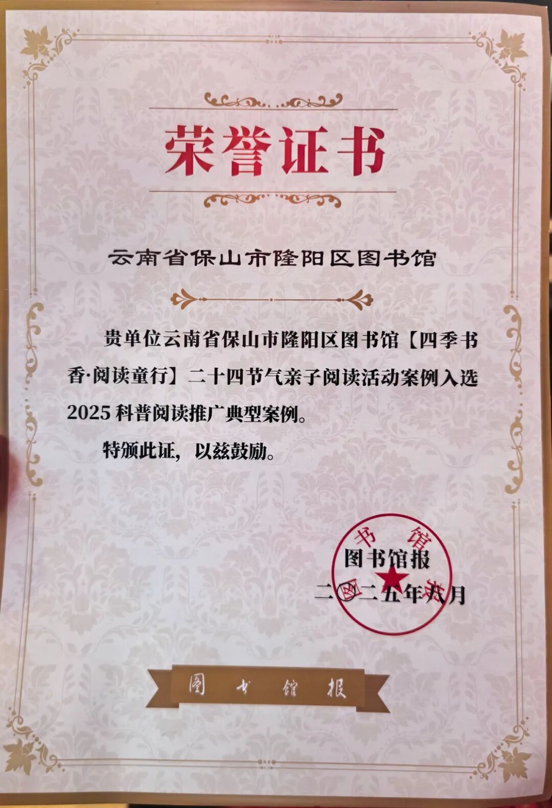 近日,隆阳区图书馆精心打造的“四季书香 阅读童行”二十四节气亲子阅读活动,在图书馆报社主办的 “2025年科普阅读推广典型案例征集活动”中脱颖而出,荣获全国优秀案例称号。9月9日至12日,隆阳区图书馆参会人员受邀出席中国图书馆学会阅读推广工作委员会和北京市东城区文化和旅游局主办的2025年科普阅读推广研讨会,并现场捧回这份重量级荣誉。