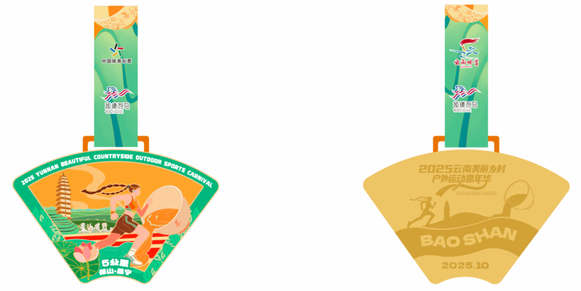 活动物料设计充分融入了昌宁特色,作为“甜甜圈”中的第四块纪念奖牌,采用多彩填色的工艺,做工精细的合金奖牌上,美少女飞奔在星河田野、茶韵公园的诗画美景之中,在茶汤幻化而成的健身步道上,意气风发的她发辫迎风飘舞,足尖轻盈地掠过盛开的荷塘,昌宁的地标文笔塔傲然屹立在远方,宛若翡翠的茶山在背景中铺陈开来,奖牌设计构思精巧,显得大气磅礴、充满了运动健康的正能量。作为昌宁县境内举办的首个美丽乡村户外运动嘉年华活动,这块纪念奖牌制作工艺精美、匠心独具,值得永久收藏。