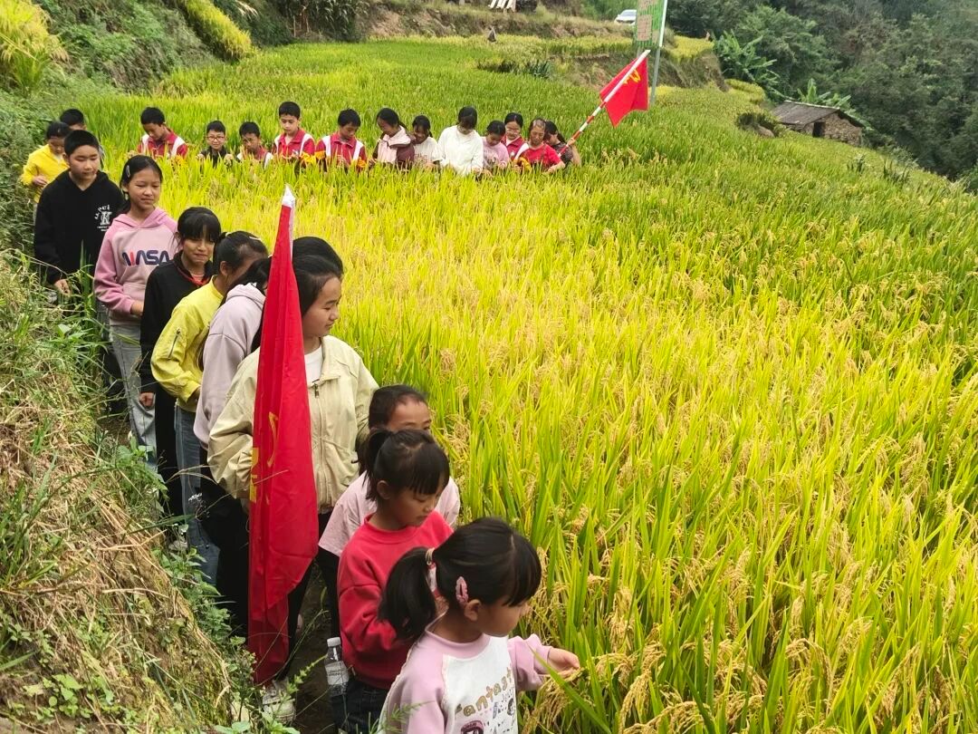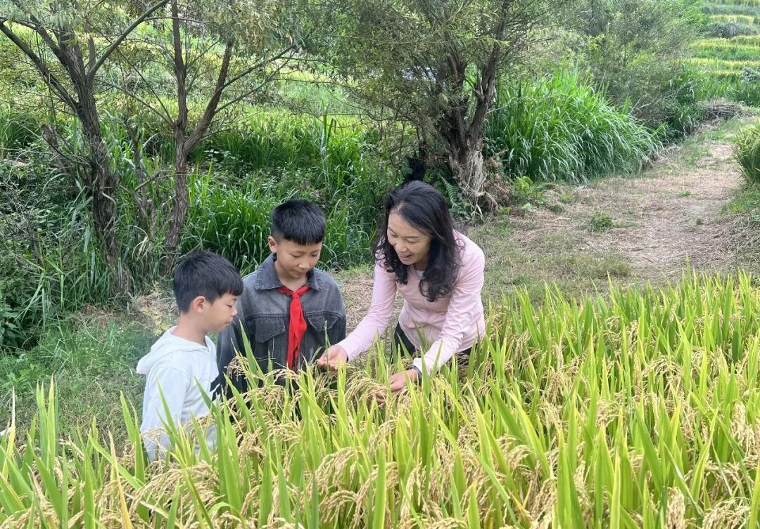 活动现场,大水沟村党总支书记陈应才告诉孩子们,以前这里因缺水,种水稻难上加难,这片田荒了快十年。县农技推广中心高级农艺师余常山则用通俗语言,讲解了旱稻从品种筛选、精准播种到日常管护、病虫草害防治,每一步都凝聚着技术人员的心血。孩子们站在田埂边,轻触稻穗,闻着稻谷清香,感受颗粒饱满的质感,听着“一粒旱稻历经数月才成熟”的讲解,眼中满是好奇与震撼。