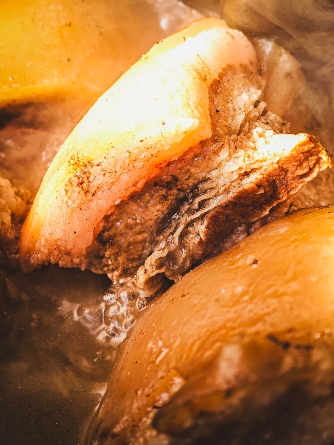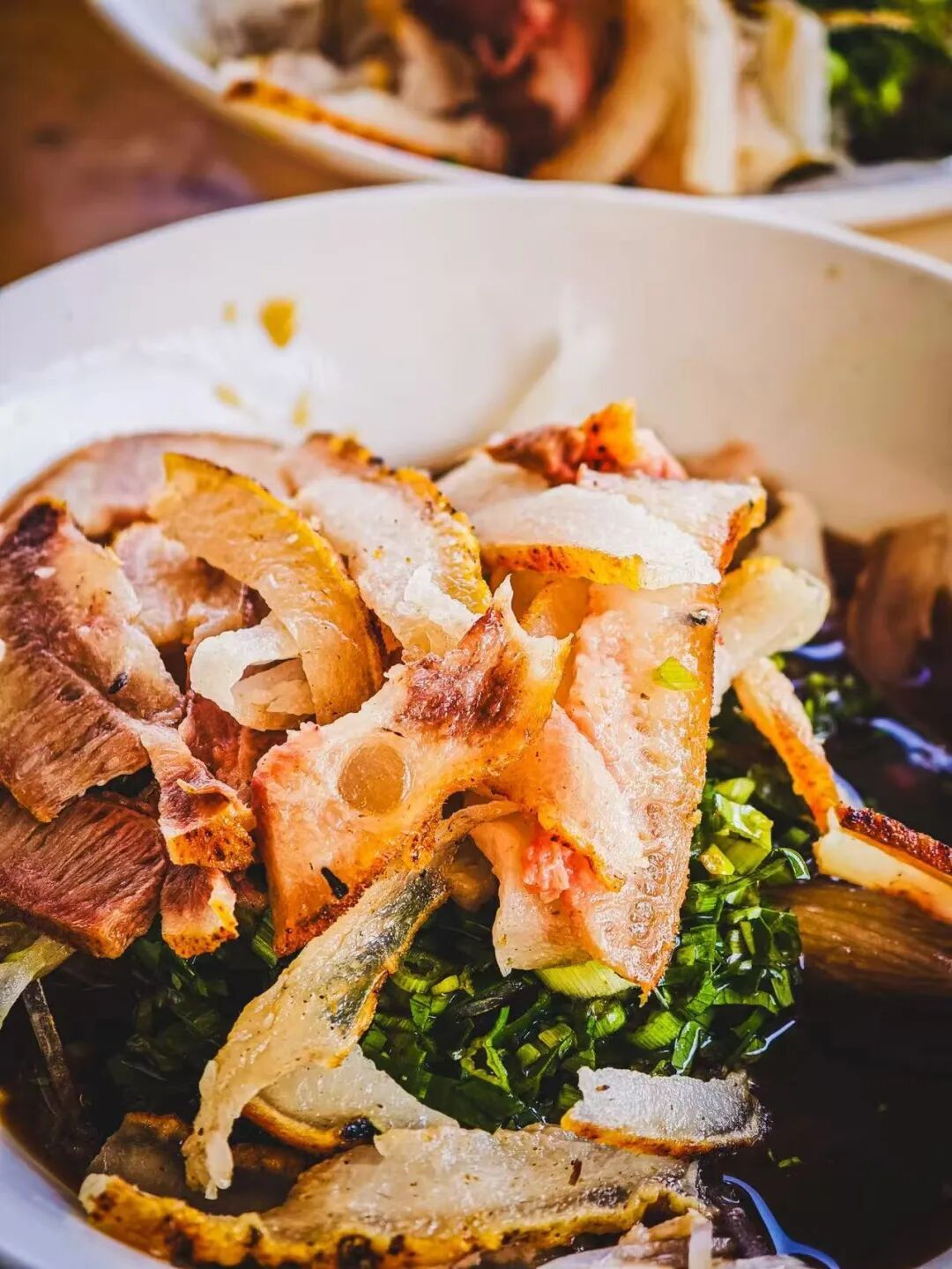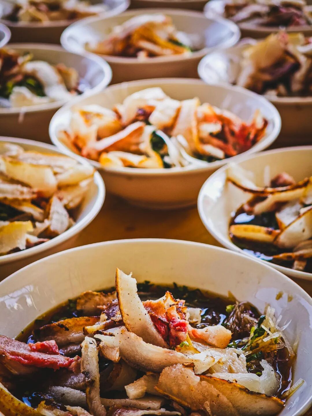 作为年猪饭的“压桌菜”,白片肉的做法看似简单,却最考验食材与火候。精选年猪五花肉,经清水慢煮至肉质软烂,捞出后切成薄片,肥瘦相间、纹理清晰。无需复杂调味,仅搭配一个简单的蘸水,入口肥而不腻、瘦而不柴,自带猪肉的鲜香本味,一口下去满口脂香,是施甸年猪饭不可或缺的经典菜品。