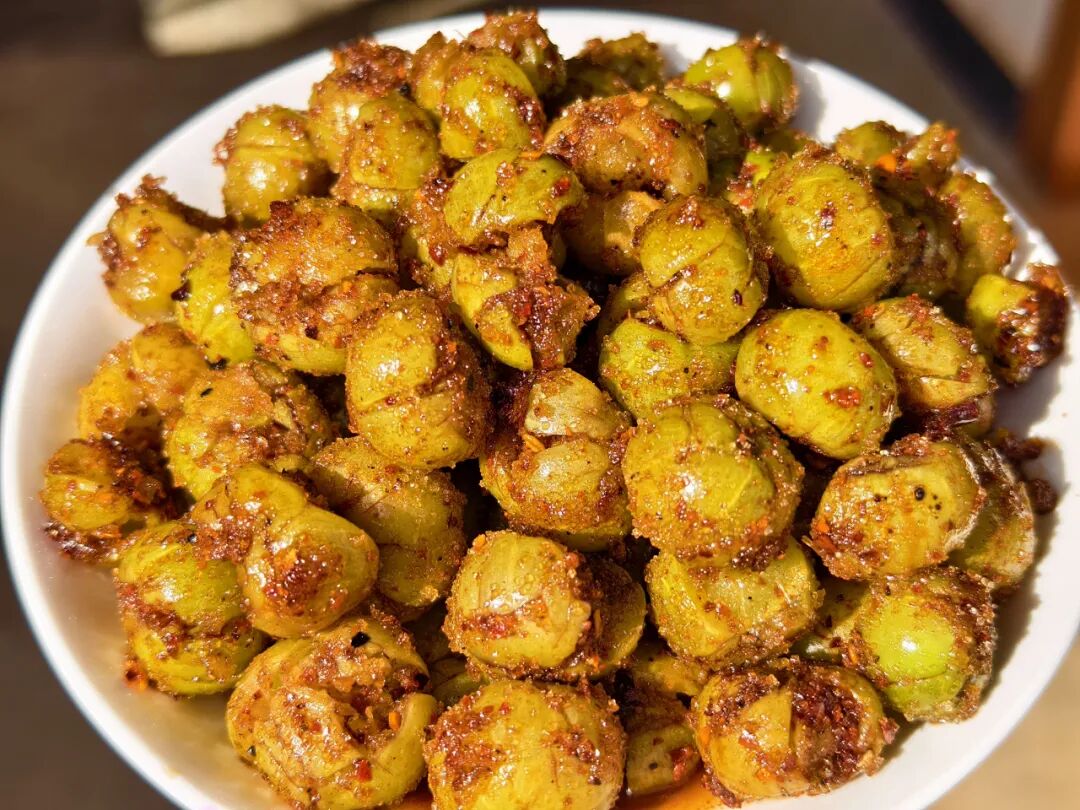 在金鸭塘村,乡亲们路过橄榄树时,总会随手摘上一把。回家洗净、轻拍,佐以盐、辣椒与少许糖料,简单腌渍片刻。待橄榄吸足料汁,褪去涩意,便成了一道酸辣回甘的乡土小食。它就像一份随手可得的“山野下午茶”,清新爽口,解乏生津。