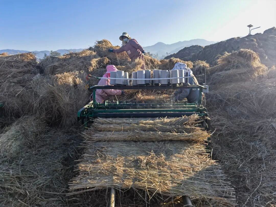 稻谷完成收割以后,龙江乡的田野间并未沉寂。成捆的稻草经过编织机的加工,变身为一卷卷厚实平整的草席,即将发往各地,用于蔬菜生产基地、物流防护等领域。