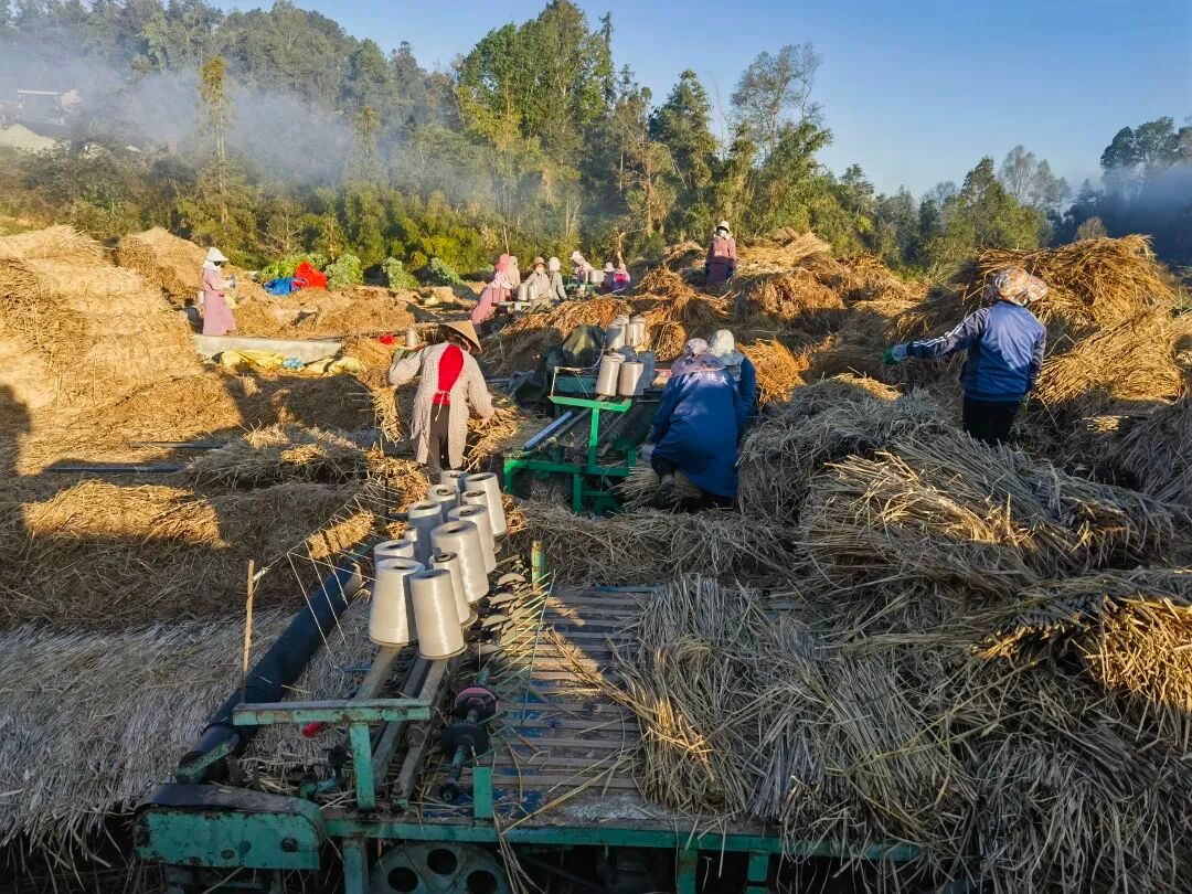 在草席加工厂,20名工人正忙着分拣、加工稻草。来自楚雄的朱洪军,五年前就曾考察龙江乡的稻草资源,今年他下定决心,在此扎根发展。“龙江水稻品质好,绿色无污染,稻草纤维强、韧性足,非常适合加工草席。”朱洪军与当地签订了五年场地租赁协议,今年计划收购稻草30万捆,约300万斤。截至目前已收购稻草10万捆,收购价为每捆2.5元。
