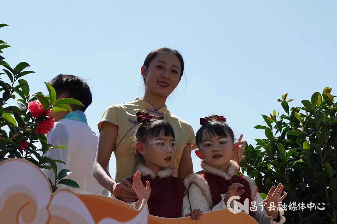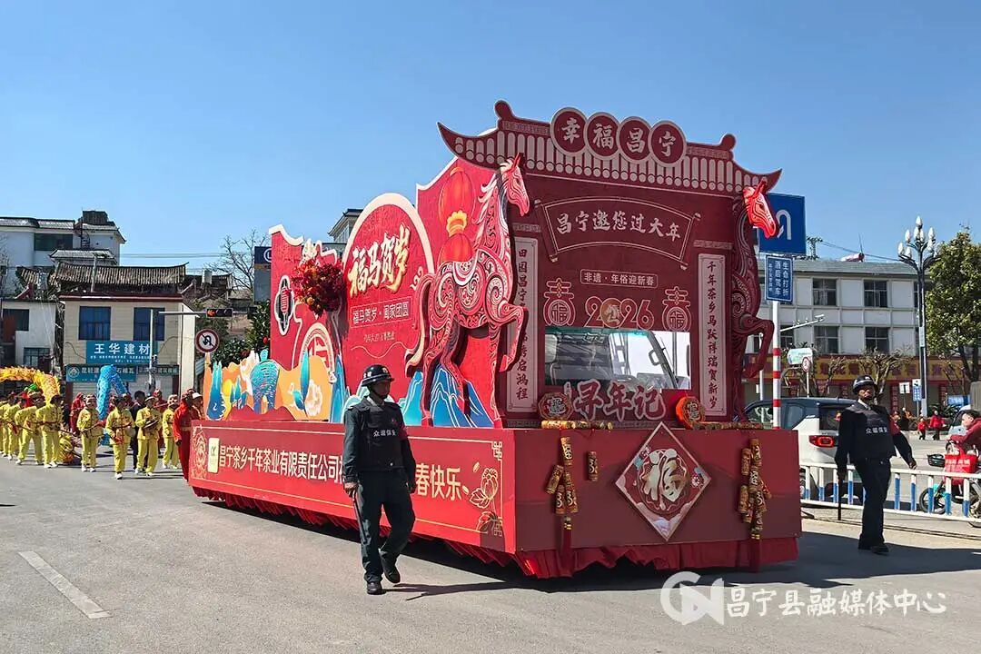喜庆的氛围铺满昌宁县城,午后的街头巷尾张灯结彩、人头攒动,处处洋溢着过年的热闹与欢喜。13时,融合乡村振兴成果、民俗风情特色与马年吉祥元素的主题花车缓缓启程,红金主色调勾勒出骏马踏春的灵动造型,将千年茶乡、茶马古道等非遗符号与新春美好寓意巧妙结合,既尽显昌宁深厚的文化底蕴,又展现出昂扬向上的时代新貌。花车之上,昌宁县各民族表演者身着盛装亮相,面带笑容向沿途市民挥手送福,传递着新春的美好祝福。