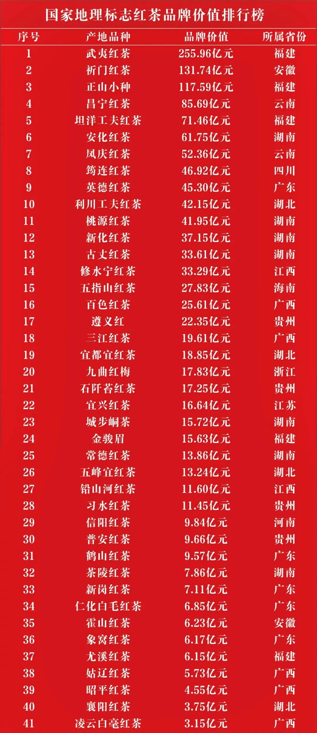 根据中国地标节组委会统计,中国目前共有41个国家地理标志红茶。41个国家地理标志红茶品牌价值总额为1391.01亿元,每个国家地理标志红茶平均品牌价值为33.93亿元。