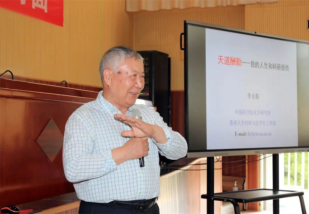 “艰难困苦,玉汝于成”。李永舫院士他以自己的科研历程为例,向学生们展示了科学研究的感悟,他的分享让学生们明白了成功的关键在于自己的努力和坚持。在李院士心中,成功=热爱+用心+努力+认真。他的座右铭“顺其自然、抓住机会、致力科研、乐在其中”深深地触动了学生们。