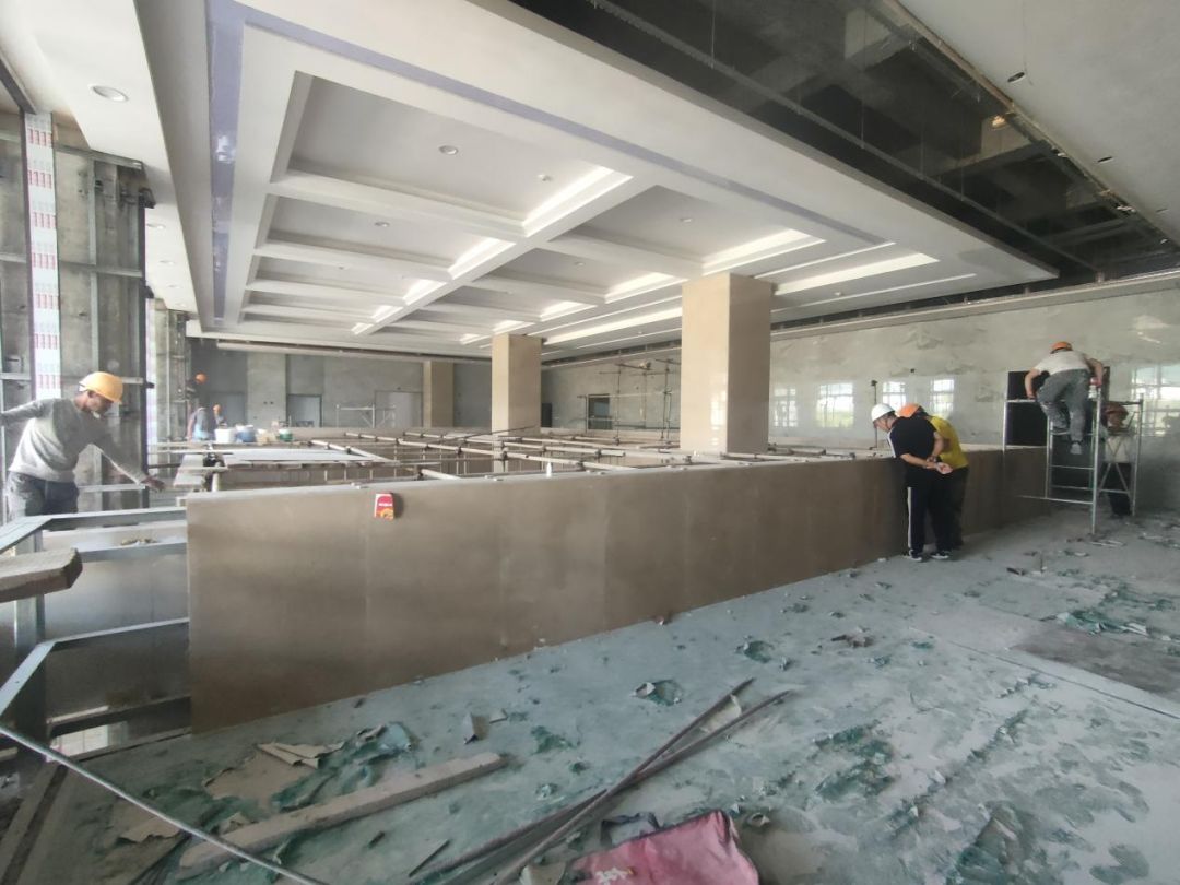 据悉,项目室外绿化树木种植完成96%,西侧道路完成开挖及管线预埋,正在进行回填。1号学员宿舍楼装修工程基本完工,正在进行家具安装;2号学员宿舍楼装修工程完成约60%,正在施工木饰面及墙面装修工程,家具已完成订货,宿舍楼建成后可以同时容纳400人入住。综合楼装修工程完成75%,准备施工木饰面、木地板;餐厅装修已经接近尾声,接下来将进行厨房设备安装。