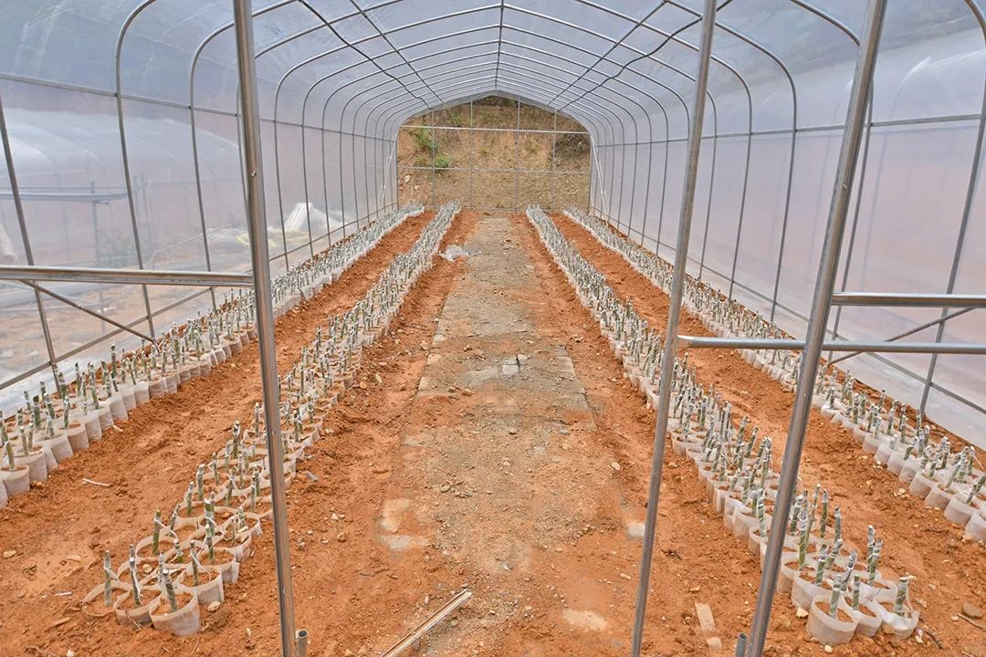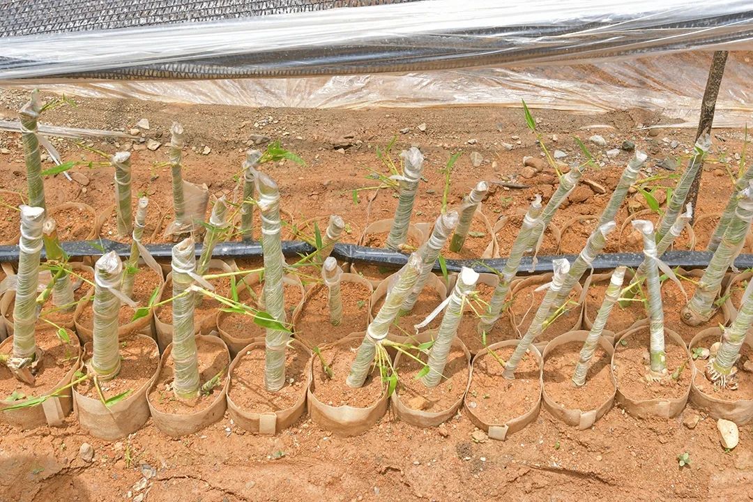宽敞的大棚里,竹苗整齐列队、长势喜人、绿意盎然。看着一排排翠绿的竹苗,王文新开心地介绍了起来:“这个棚里的甜龙竹苗苗龄已经20多天,培育的苗木一般3天左右开始发芽,培育成活的苗木15天左右就全部长根发芽,我们对每一株苗都悉心照料,争取早出棚、早种植、早上市。”