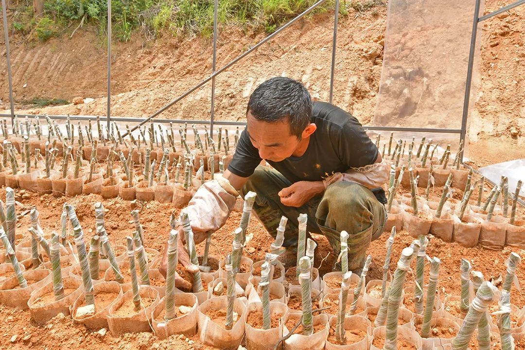 育苗户李素钧的育苗基地里一片热火朝天的繁忙景象,这边工人们正在抓紧时间整地、灌水、扦插,那边一排排绿油油长势正旺的苗圃地边,各地采购商的车辆在急切地等待装车运出,呈现出一幅热闹有序的“收获图”。作为具有10多年甜龙竹育苗经验的育苗专家,在育苗、管理、销售等方面,他始终都发挥着“火车头”的作用。今年,李素钧从3月初就开始育苗,抢抓农时,全力保障育苗的质量和数量。