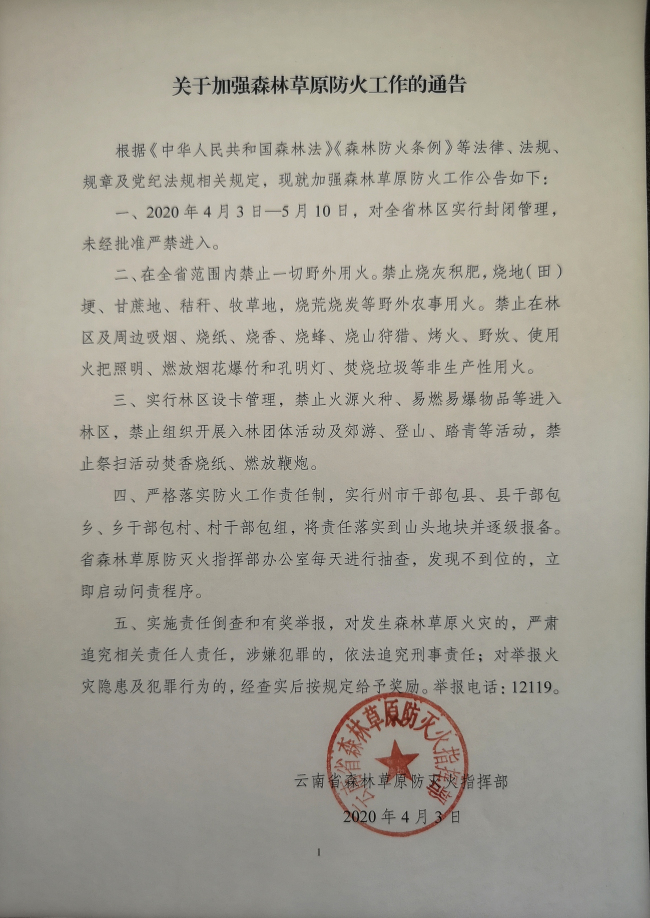 一、2020年4月3日-5月10日,对全省林区实行封闭管理,未经批准严禁进入。