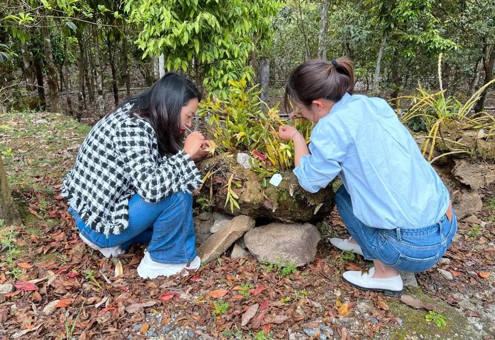 来自云南农业大学的在读研究生正在龙陵县石斛种质资源中心观察石斛花开。