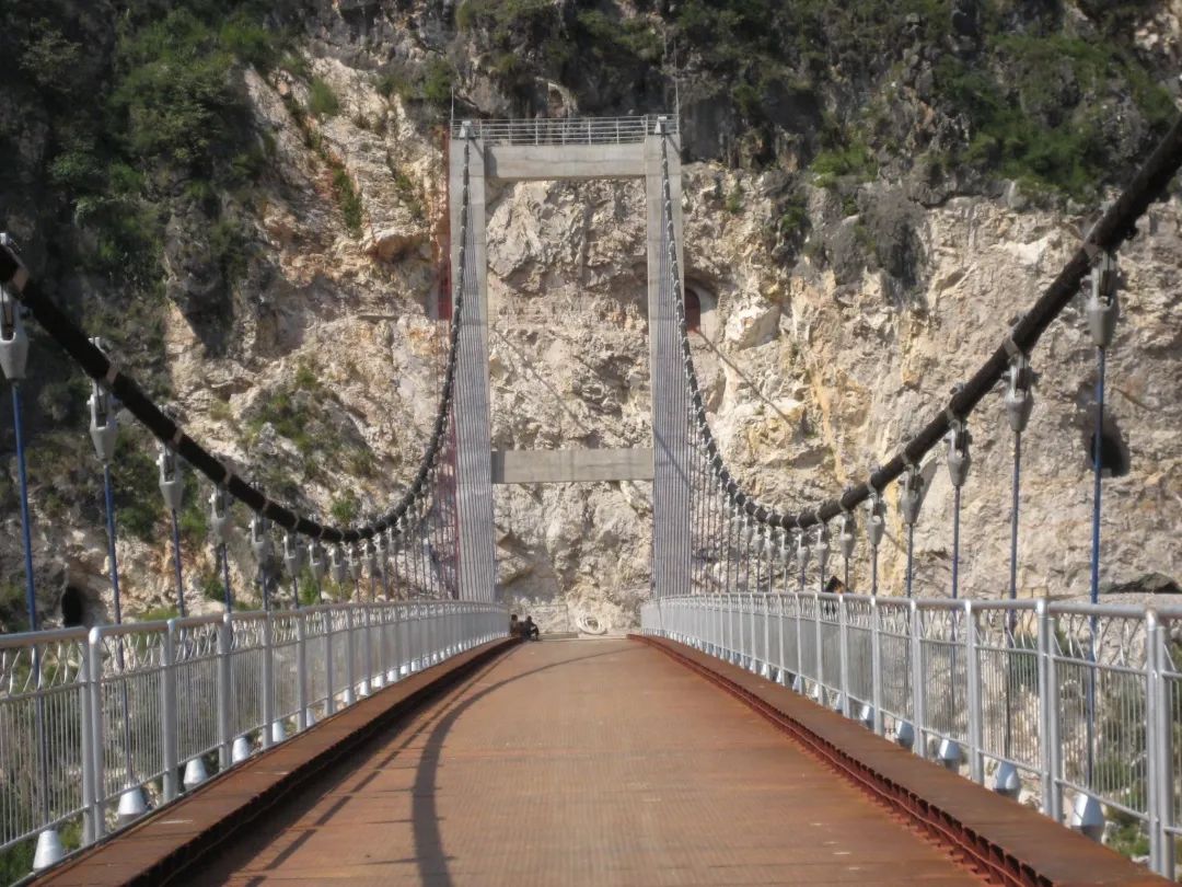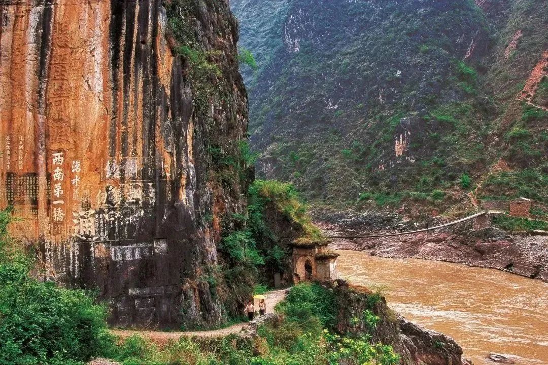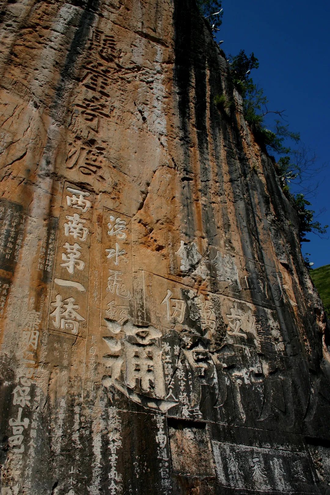 霁虹桥是我国最古老的铁索桥之一,史传开始修建于诸葛亮南征时,那时还只是篾索桥,到明朝时修起了铁索桥,此后几度被冲毁又几度修建。在桥的西端桥头原有非常壮观的摩崖石刻,刻有“人力所通”“西南第一桥”等反复累加层叠的题词。