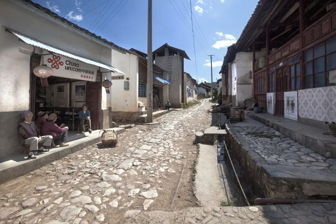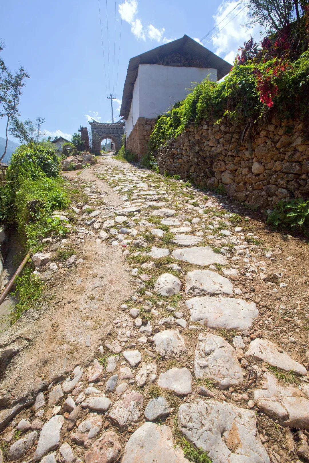 村寨后靠陡坡山崖,前为江流环绕,自古以来就是古道过江进入保山地界的第一个歇脚站,古道自霁虹桥沿山麓而上,自北向南穿寨而过。村口两端各设券洞街门,寨内居民沿路建房、夹路成街。