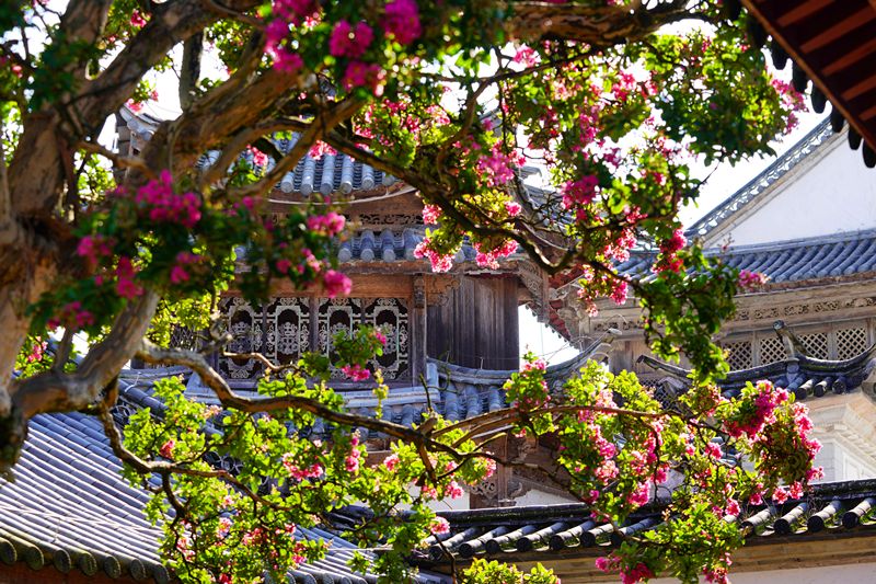 当古建筑木质的素朴,叠檐飞拱的雄壮,雕梁镂窗的精美,金彩粉饰的典雅,与映阶窥窗、飞霞流丹的紫薇花相衬相映,一幅诗意的画卷便徐徐展开了。碧瓦飞甍间,雕梁画栋下,紫薇花团团簇拥,串串坠玉,姹紫嫣红,云蒸霞蔚。