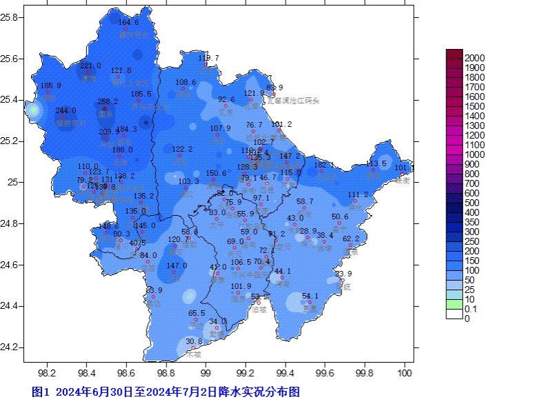 受高空低槽和西南暖湿气流影响,2024年6月30日至7月2日,保山大部地区出现连续性强降水天气过程,累计降水量在25.0~49.9mm的25站,50.0~99.9mm的118站,100.0~149.9mm的81站,150.0~200.0mm的21站,200.0~250.0mm的10站,250mm以上的有2站,最大降水量出现在腾冲市林家铺子,降水量为258.8mm;全市共有261站,出现大雨(日雨量25.0~49.9mm)172站次,暴雨(日雨量50.0~99.9mm)139站次,大暴雨(日雨量100.0~249.9mm)38站次,为今年入汛以来最强的一次降水天气过程。其中7月1日出现全市性大到暴雨局部大暴雨天气,大雨66站、暴雨125站、大暴雨38站,单站日最大降水量达180.8毫米(腾冲市固东镇),全市日平均降水量达到64.1毫米。