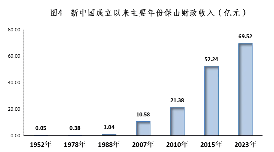 财政实力日益增强。新中国成立初期,百废待兴,财政基础十分薄弱,1952年保山地方财政收入仅有0.05亿元,1978年也只增加到0.38亿元,随着改革开放步伐的加快,保山的经济实力显著提升,财政收入实现快速增长,至1988年突破亿元关口,达1.04亿元,2007年突破10亿达10.58亿元,2010年突破20亿元达21.38亿元,2015年突破50亿达52.24亿元。2023年财政收入达69.52亿元,增长27.3%,是1952年的1390倍。为促进经济社会发展、改善人民生活水平提供了有力的资金保障。