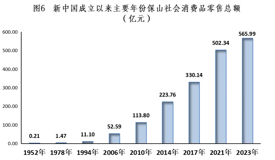 消费市场繁荣活跃。随着市场化改革的不断深化,保山消费市场发生了巨大变化,商品供应由计划经济时期凭票供应发展到商品市场多渠道、多层次、全方位、网络化的城乡商品流通体系,城乡市场繁荣兴旺。互联网的发展为消费转型提供了平台,电商平台的快速发展,网络购物的普及,移动支付的盛行,消费渠道不断拓宽,实现了足不出户随意购,满足人们多层次的消费需求,消费市场繁荣活跃。1952年全市社会消费品零售总额仅有0.21亿元,1978年也只增加到1.47亿元,1994年突破10亿达11.10亿元,2006年突破50亿元达52.59亿元,2010年突破100亿达113.80亿元。2021年突破500亿元达502.34亿元。2023年,全市社会消费品零售总额达566亿元,是1952年0.21亿元的2695倍,年均增长11.8%;是1978年1.47亿元的385倍,改革开放以来年均增长14.1%。