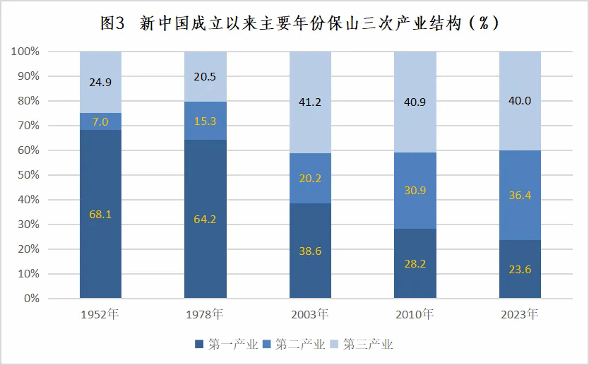 结构不断调整优化。1952年,全市三次产业比重为68.1:7.0:24.9,1978年为64.2:15.3:20.5,一产占绝对主导地位。改革开放后,经过农、工、商多元快速发展,经济结构深刻变化。至2003年调整为38.6:20.2:41.2,服务业比重首次超过农业,实现历史性突破;2004年全市提出走“新型工业化道路”、实施“工业强市”战略,工业聚集化进程加快,2010年调整为28.2:30.9:40.9,第二产业比重首次超过第一产业,实现了由农业为主向三次产业协同发展的转变,到2023年时调整为23.6:36.4:40,服务业和工业主引擎作用进一步凸显。